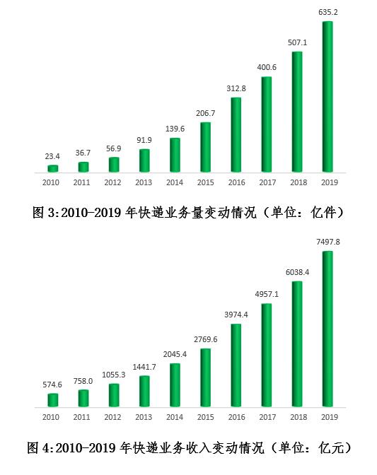 市場規(guī)模中高速增長。2019年,全國快遞企業(yè)日均快件處理量超1.7億件,同比增長25.3%,最高日處理量達(dá)5.4億件,同比增長28.5%。全國快遞業(yè)務(wù)量突破600億件,累計完成635.2億件,同比增長25.3%,增量規(guī)模連續(xù)兩年超過100億件??爝f業(yè)務(wù)收入累計完成7497.8億元,同比增長24.2%,量收增速差從去年的4.8%進(jìn)一步縮小為1.1%,行業(yè)逐漸由規(guī)模單向驅(qū)動向規(guī)模效益雙向驅(qū)動轉(zhuǎn)變。與2010年相比,快遞業(yè)務(wù)量收分別增長了26.1倍和12.0倍,業(yè)務(wù)收入年均復(fù)合增長率是同期國內(nèi)生產(chǎn)總值增速的4倍,成為拉動經(jīng)濟增長的重要動力。