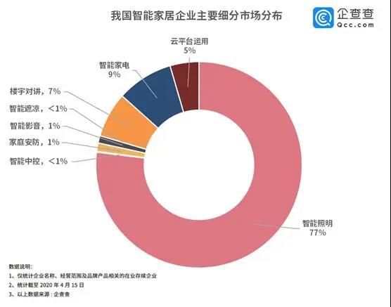 家電不再是冷冰冰的擺設(shè),而是被賦予了審美和情感需求的個(gè)性化智能產(chǎn)品。智能家居作為新興行業(yè),其無接觸式的交互方式,給疫情期間的人民帶來安全、智能的生活體驗(yàn),其優(yōu)勢(shì)開始凸顯。企查查整理了我國智能家居企業(yè)八大細(xì)分市場(chǎng),數(shù)據(jù)表明智能照明、智能家電、樓宇對(duì)講相關(guān)企業(yè)占比較高,分別為77%,9%,7%;此外,家庭安防和智能影音也頗受市場(chǎng)青睞。