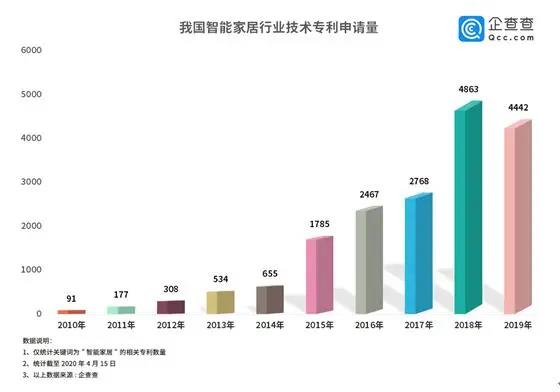 潛力巨大的“藍(lán)海”市場(chǎng)早已廠商云集,智能家居行業(yè)技術(shù)專利申請(qǐng)量迅速攀升。企查查數(shù)據(jù)顯示,我國智能家居相關(guān)專利申請(qǐng)總量早已破萬,2015年開始我國智能家居行業(yè)技術(shù)邁入快速發(fā)展期,2018年達(dá)到巔峰,數(shù)量達(dá)4863件,較2017年同比增長了76%,2019年專利申請(qǐng)數(shù)稍減。由此可見,智能家居市場(chǎng)競(jìng)爭(zhēng)較為激烈,各路玩家步伐急促。