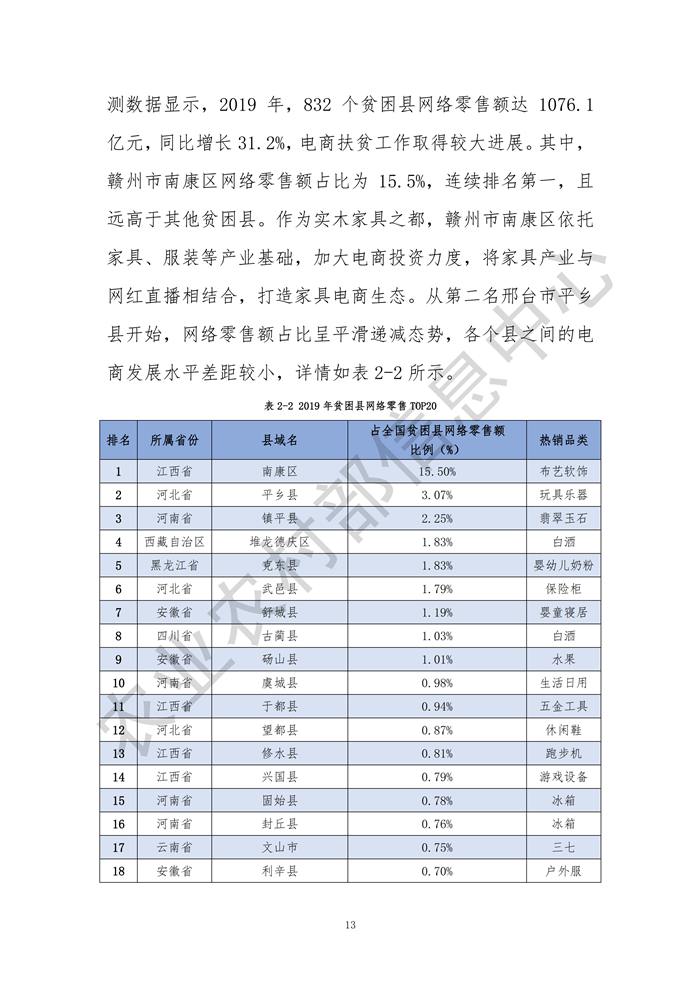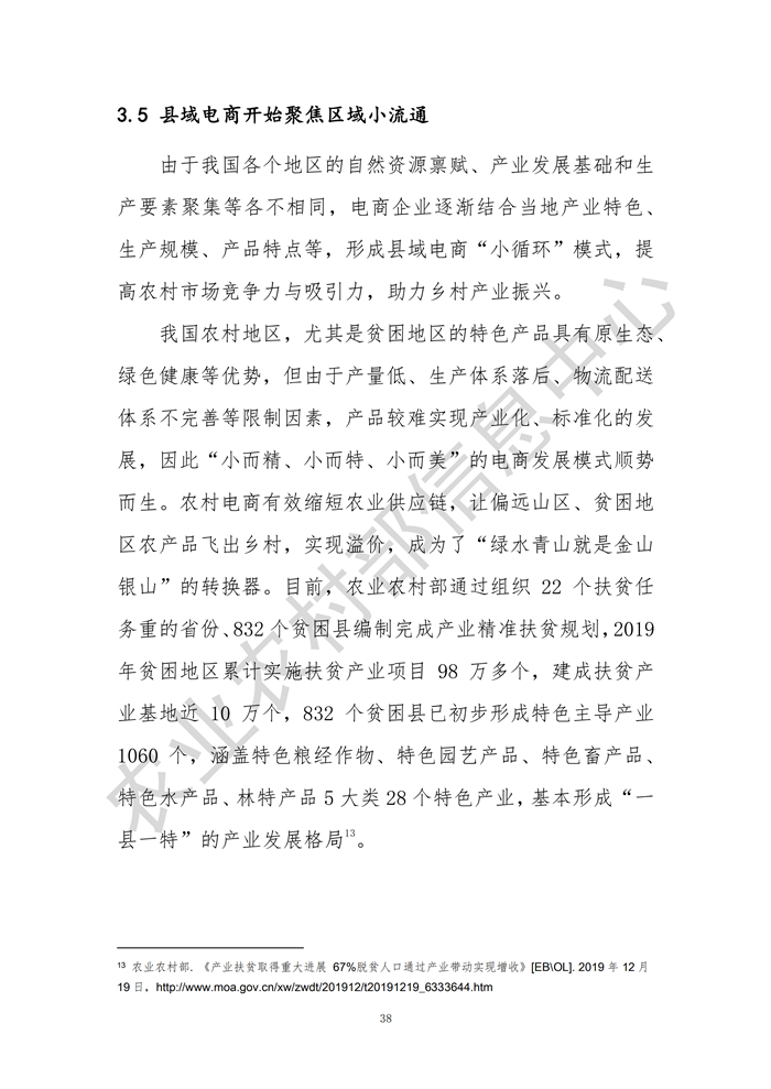 發(fā)布會指出,2019年全國2083個縣域網絡零售額達30961.6億元,同比增長23.5%,其中832個貧困縣網絡零售額達1076.1億元,同比增長31.2%;縣域農產品網絡零售額達2693.1億元,同比增長28.5%,其中832個貧困縣農產品網絡零售額為190.8億元,同比增長23.9%,需求側的數(shù)據(jù)、信息日益成為供給側結構性改革的新動能,農業(yè)的產業(yè)鏈、供應鏈、創(chuàng)新鏈、價值鏈正在加速重構,電子商務成為“綠水青山就是金山銀山”的重要“轉換器”。